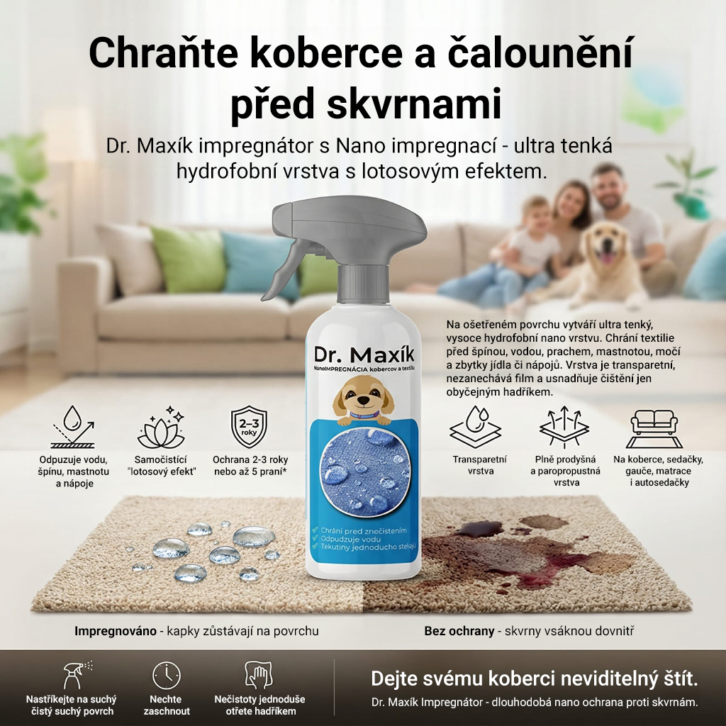 Chraňte svůj koberec nebo čalouněný nábytek s naším špičkovým impregnačním přípravkem na bázi nano částic - Dr. Maxík Impregnátor. Tato vodní impregnační tekutina poskytuje vynikající ochranu pro koberce, sedací soupravy, pohovky, gauče, taburety, křesla, lenošky, sedací pytle, matrace. Skvělé řešení také pro autosedačky.