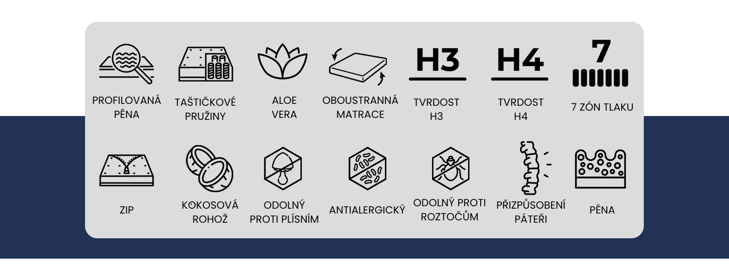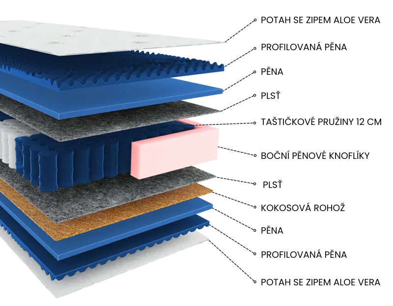 Matrace DREAM s taštičkovými pružinami a užívejte si pohodlný spánek po celá léta. Uvnitř je tvarovaná pěna s masážními vlastnostmi, která je navržena tak, aby během spánku správně pečovala o vaši páteř a 12 cm taštičkové pružiny, které matraci poskytují zóny pevnosti. Tvarovaná pěna je pružná a má masážní výstupky. Zajišťuje správné držení těla a optimální polohu při spánku. Naše matrace poskytuje přiměřenou oporu jednotlivým částem těla po celou noc. Taštičkové pružiny vytvářejí 7 zón pevnosti, přizpůsobují se vašemu tělu a poskytují dokonalou oporu bez ohledu na vaši polohu při spánku. Pěna je pružná a zodpovědná za správné větrání matrace. Její vysoká hustota zajišťuje odolnost vůči deformaci. Plst je vrstva, která izoluje pružiny od pěny a zabraňuje deformaci. Zároveň zpevňuje a tlumí konstrukci matrace. Taštičkové pružiny hrají klíčovou roli v konstrukci matrace. Jsou umístěny v jednotlivých kapsách/potazích a fungují nezávisle na sobě a reagují na tlak těla. Přizpůsobují se tvaru a hmotnosti každé osoby, čímž poskytují lepší oporu páteře a zvýšené pohodlí. Kokosová rohož je přírodní materiál, který poskytuje matraci správnou pevnost a oporu páteře. Zároveň chrání ostatní vrstvy před nadměrným opotřebením. Součástí matrace je potah s extraktem z aloe vera.