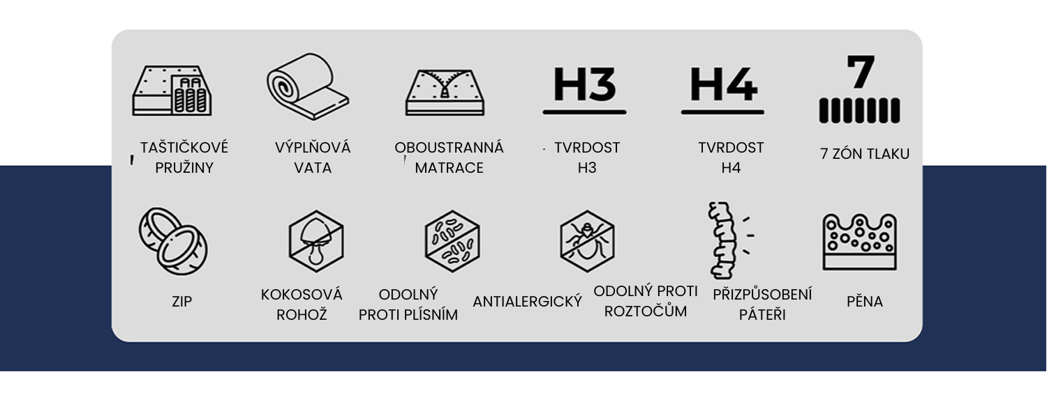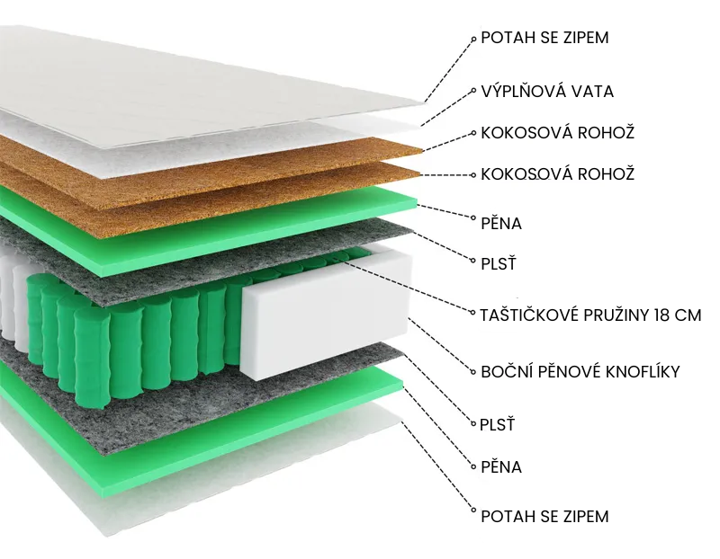 Při navrhování modelu ELITE se kladl důraz na to, aby se matrace přizpůsobila tvaru těla. Vrstvy dynamicky reagují na tlak ve specifických oblastech, čímž pomáhají rovnoměrně rozložit tělesnou hmotnost a snížit bodovou deformaci. 18 cm vysoké pružiny, pružná pěna a 2 vrstvy přírodního kokosového vlákna jsou ideální volbou pro lidi, kteří hledají odolnou a zároveň pohodlnou matraci, která poskytne celému tělu správnou oporu během spánku. Matrace Harmony má výšku 24 cm a je modelem z naší nové řady moderních a pohodlných matrací. Potah je opatřen zipem, který zajišťuje správné větrání matrace a pomáhá udržovat příjemnou teplotu během spánku. Díky zipu lze v případě potřeby snadno odstranit a obnovit. Vata je vrstva, která pomáhá při tepelné izolaci matrace. V zimě poskytuje dostatečné teplo a v létě chrání před přehřátím. Kokosová rohož je přírodní materiál, který dodává matraci pevnost a poskytuje oporu páteři a zároveň chrání ostatní vrstvy před nadměrným opotřebováním. Pěna je pružná a zodpovědná za správné větrání matrace. Její vysoká hustota zajišťuje odolnost vůči deformaci. Plst slouží jako vrstva, která odděluje pružiny od pěny a zabraňuje deformaci. Zároveň zpevňuje strukturu matrace a působí jako tlumič nárazů. Taštičkové pružiny hrají klíčovou roli v konstrukci matrace. Každá pružina je umístěna v samostatné kapse, což jim umožňuje fungovat nezávisle. Díky tomu se matrace dokonale přizpůsobí tvaru těla a poskytne oporu tam, kde je nejvíce zapotřebí.