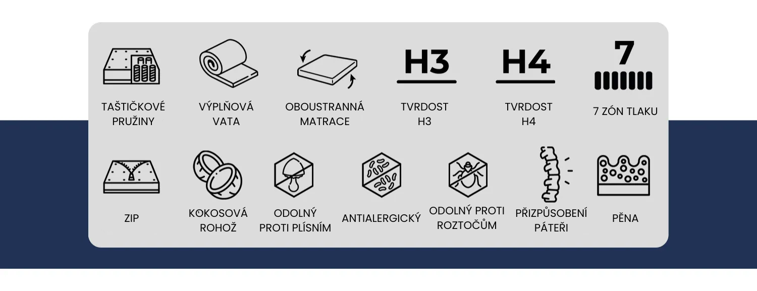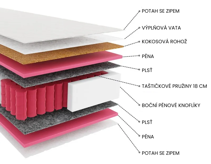 Tento produkt je součástí naší nové řady moderních a pohodlných matrací. Jeho důmyslný design podporuje cirkulaci vzduchu, díky čemuž je matrace mimořádně prodyšná. Zapomeňte na horké a nepohodlné noci – s naší matrací budete spát při ideální teplotě. Potah na zip zajišťuje dostatečné větrání matrace a pomáhá udržovat příjemnou teplotu během spánku. Má také zip, takže jej můžete v případě potřeby sundat a osvěžit. Vata je vrstva, která pomáhá zajišťovat tepelnou izolaci matrace. V zimě udržuje tělesné teplo a v létě zabraňuje přehřátí. Kokosová rohož je přírodní materiál, který poskytuje pevnost a oporu páteře a zároveň chrání ostatní vrstvy před nadměrným opotřebováním. Pěna je pružná a zodpovědná za správné větrání matrace. Její vysoká hustota zajišťuje odolnost vůči deformaci. Plst je vrstva, která izoluje pružiny od pěny a zabraňuje deformaci. Zároveň zpevňuje a tlumí konstrukci matrace. Taštičkové pružiny hrají klíčovou roli ve struktuře matrace. Tyto jednotlivě balené pružiny jsou umístěny v samostatných sáčcích, což zajišťuje jejich nezávislou funkci. To umožňuje matraci přesně se přizpůsobit tvaru těla a poskytnout oporu tam, kde je nejvíce zapotřebí. Matrace je vybavena 7-zónovými taštičkovými pružinami o výšce 18 cm, které poskytují přiměřenou oporu celému tělu během spánku. Taštičkové pružiny vytvářejí 7 zón pevnosti, přizpůsobují se vašemu tělu a poskytují dokonalou oporu bez ohledu na vaši polohu při spánku.